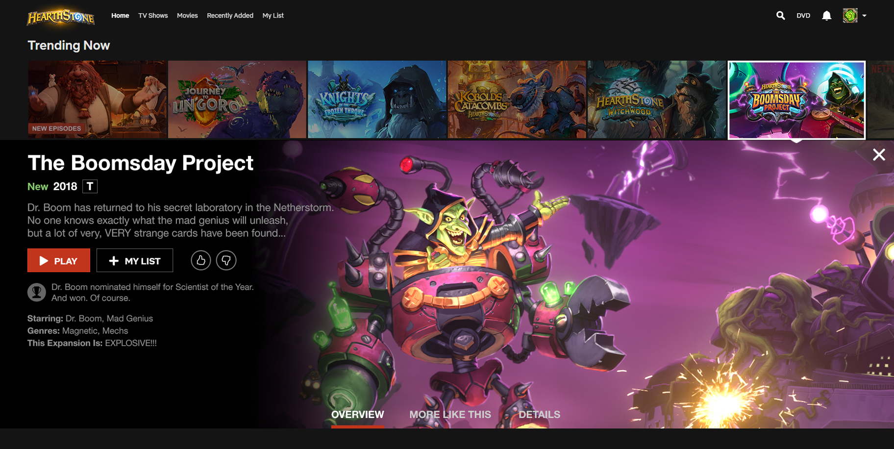 Every year, Hearthstone introduces three all-new sets of cards into the game, accompanied by themed solo-player adventures, cosmetic upgrades, hero skins, bundle promotions, and balance updates. All assets created to support these releases are designed to reach across all playerbase platforms (PC, tablet, and mobile), as well as in-person community events and conventions - notably, Blizzard's annual celebration for all its franchises, BlizzCon.